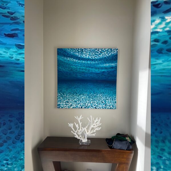 With more years of wisdom as an artist, I created the first square underwater painting and engineered a five-part process to create the ocean floor recession, water warmth, and effects of physics called Total Internal Reflection.